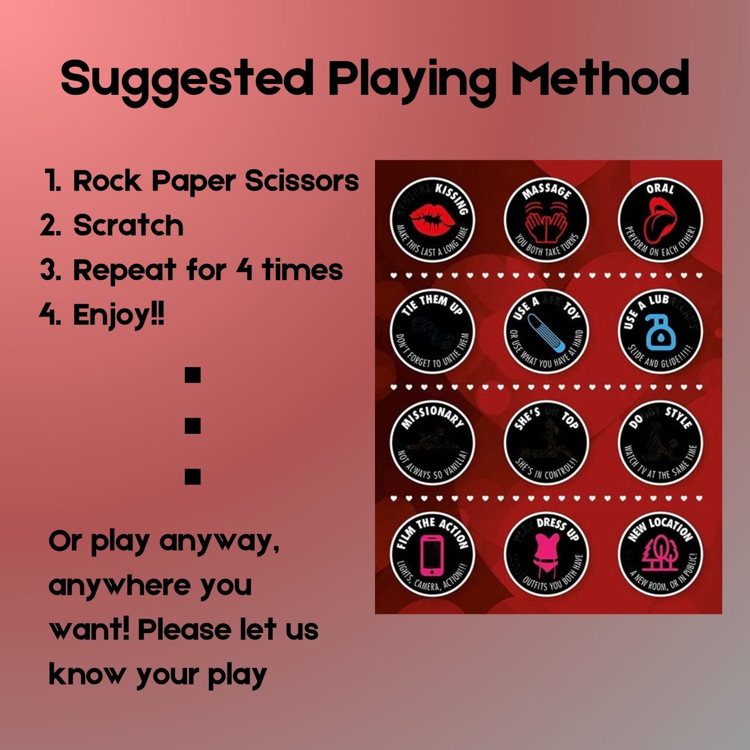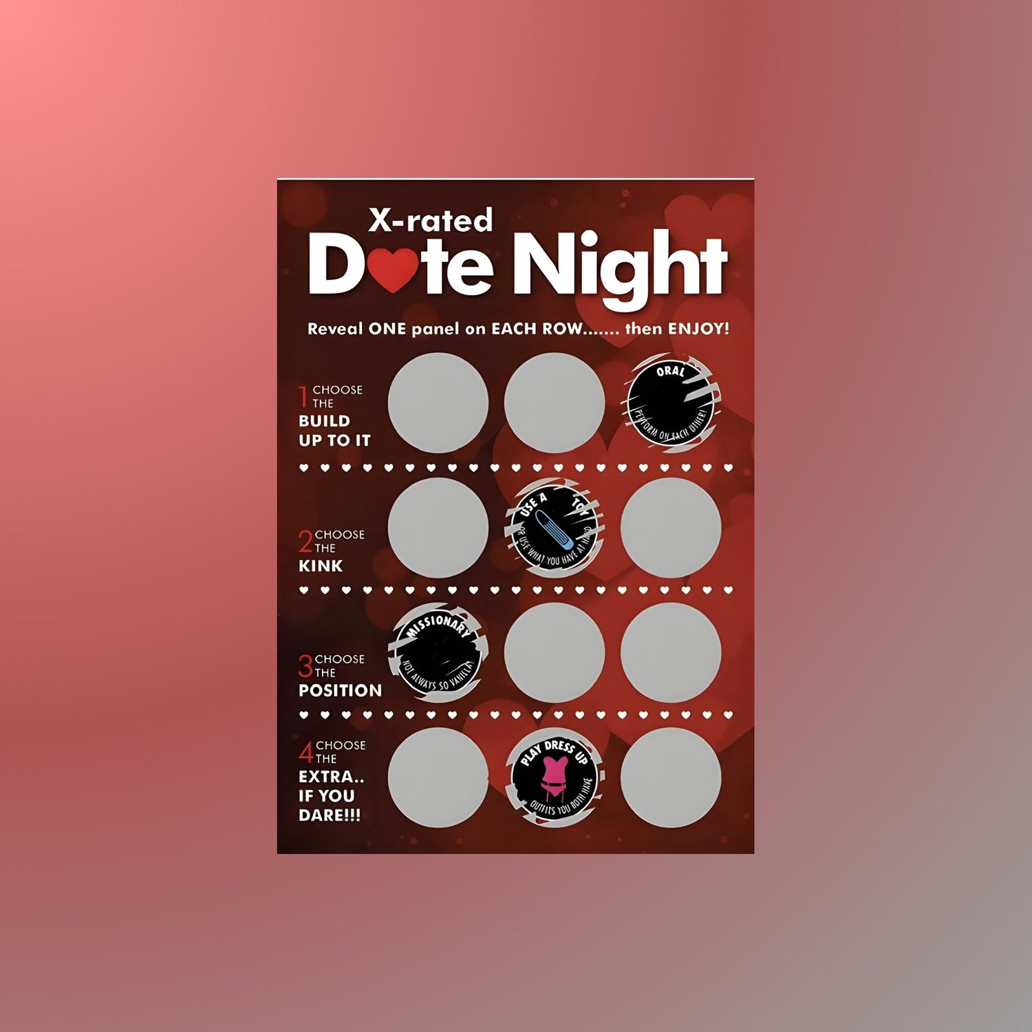 Take your romance anywhere with our versatile scratch-off date night cards! Whether at home, in a hotel, at the library, or even in secret spots like the bathroom, these cards add excitement and spontaneity to your love life. Wherever you are, let the adventure unfold!